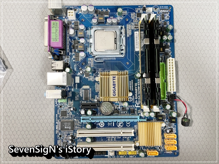| 그럼 장착할 부품을 한번 살펴볼까요? ㅎ 정겨운 파란색의 기가바이트 GA-G31M-ES2L 메인보드입니다. 메모리는 DDR2 2G 짜리 2개로 4G 구성입니다. 고성능이죠 ㅎ 나름 방열판까지 씌워주었습니다 ㅎ