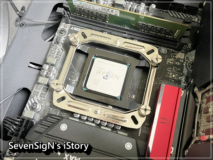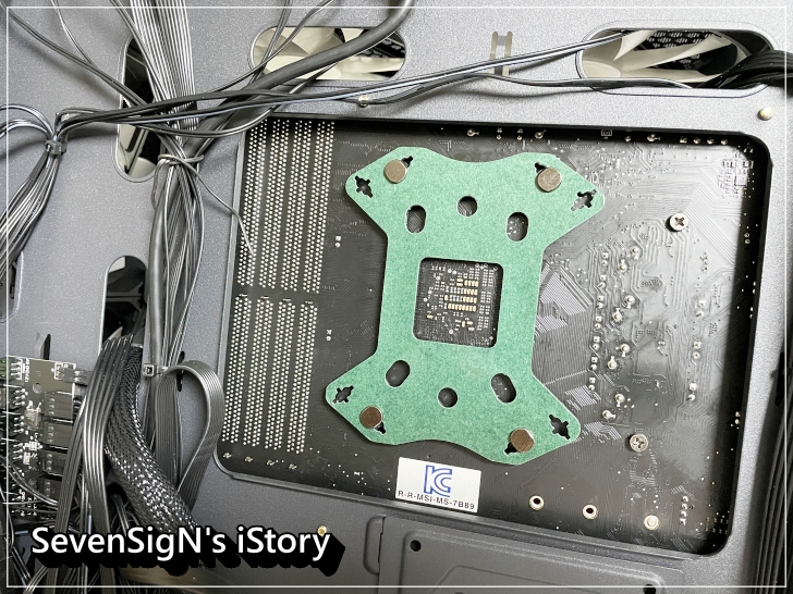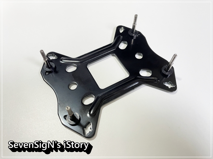 | 본격적으로 장착하는 모습입니다. 백플레이트를 메인보드 뒤에서 연결하고 앞에서 고정나사를 끼워 고정시켜줍니다. 백플레이트도 워낙 튼튼해보여서 안정감이 있는데, 튼튼한 스틸 백플레이트로 발열에도 강하다고 하네요.