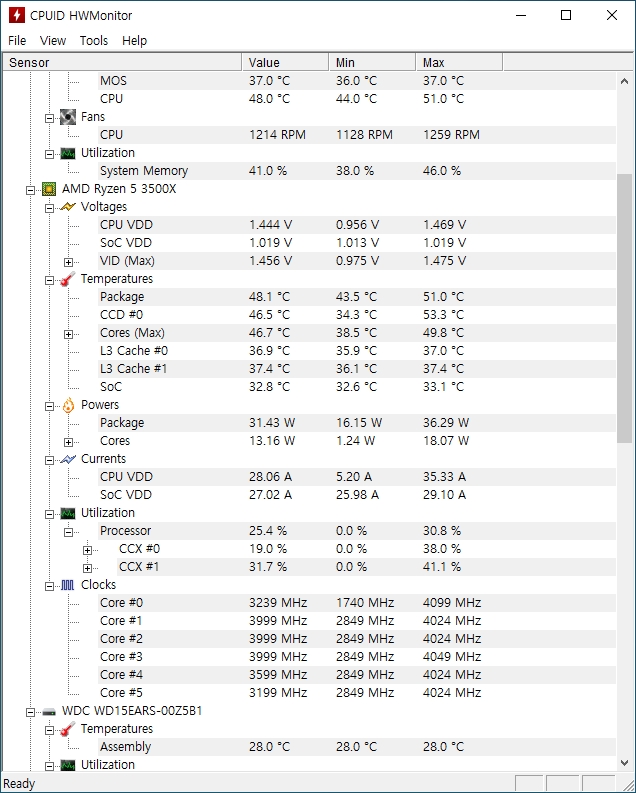 | 그리고 HWMonitor에서 확인한 스샷입니다. 아이들 상태에서 48.1도 나오고 43.5도에서 51도 사이네요.