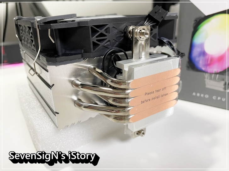 | 앱토 타이폰 120X5 ARGB (ABKO TYPHON 120X5 ARGB) 쿨러는 5중 냉각 히트 파이프를 채택하고 있어서 열을 빠르게 전달하며 좋은 쿨링 퍼포먼스를 보여준다고 하네요. CPU와 맞닿는 대형 알루미늄 베이스에는 보호비닐이 붙어있는데, 장착하기전에 잊지 말고 떼어내야 하는건 아시죠? ㅎ