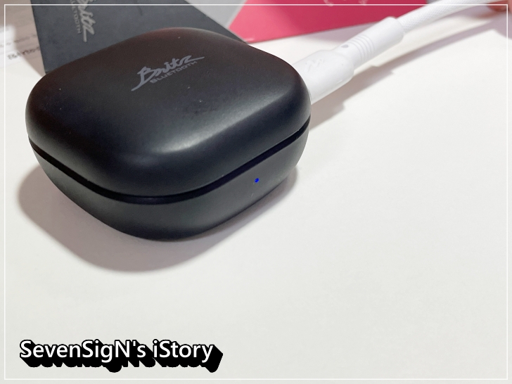 | 또다른 측면에는 USB-C 포트가 있어서 케이스를 충전할 수 있는 있고요. 케이블을 연결하면 위에서 본 측면 LED의 불빛이 파란색으로 바뀌게 됩니다. 케이스에는 300mAh의 배터리가 탑재되어 있고, 각 이어폰 유닛에는 40mAh의 배터리가 탑재되어 있는데 케이스로 2.5회정도 충전이 가능하고, 1회에 최대 24시간 사용이 가능합니다. 한번 완충하면 하루이틀 가지고 다니며 사용하는데에는 큰 무리가 없는거죠.