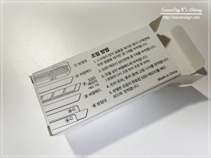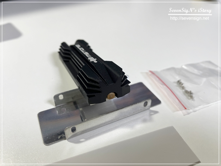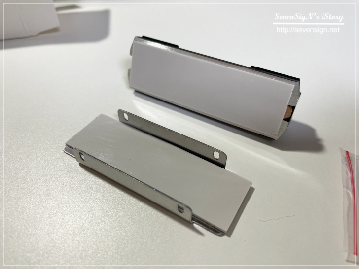 | 써멀패드 1개는 방열판 아래에 기본적으로 부착되어 있으니 보호비닐만 제거를 하고, 또 다른 써멀패드는 보호비닐을 제거하고 받침대에 부착을 합니다. 사이에 SSD를 올려두고 측면에 4개의 나사를 고정시켜주면 됩니다.