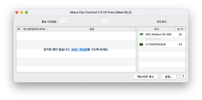 | 커스텀맥으로 사용 중이라 Macs Fan Control 이라는 프로그램으로 SSD 온도를 확인해봤는데요, 아이들 상태에서 43도 정도가 나오네요.
