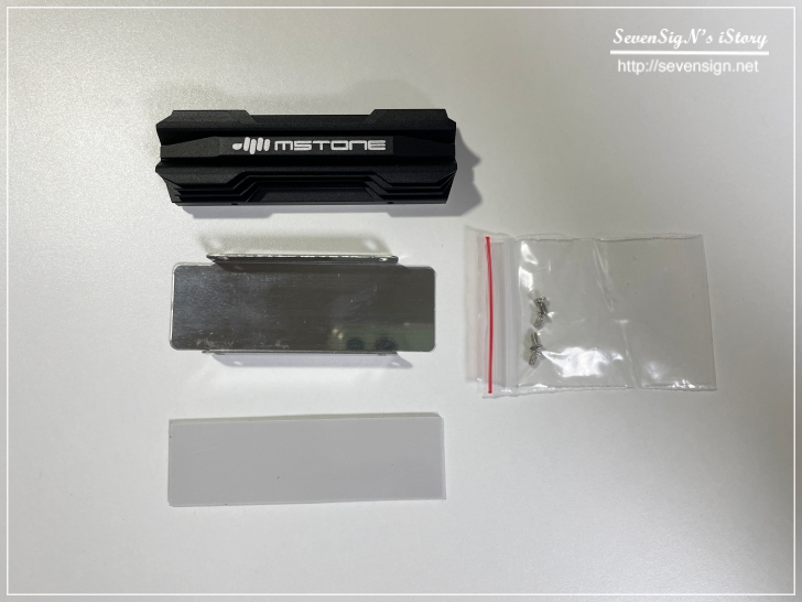 | 열을 발산하기에 좋아보이는 방열판과 써멀패드 2개(1개는 방열판에 부착되어 있음), 받침대, 나사로 구성되어 있습니다.