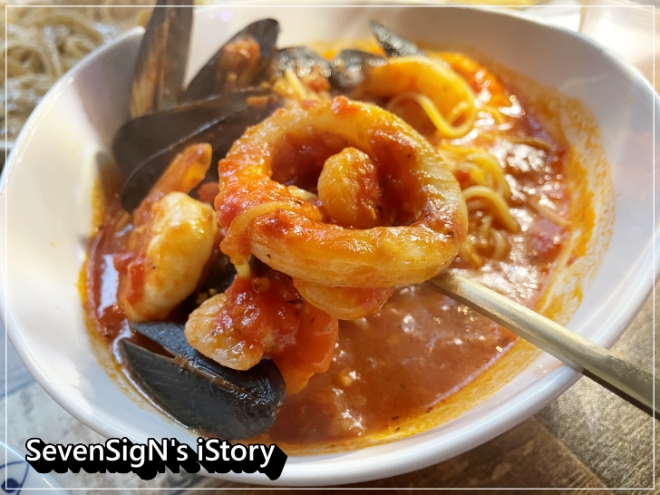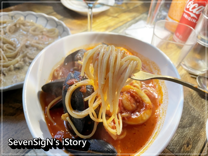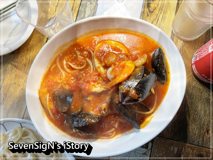 메뉴판에 '칼칼한 토마토소스와 신선한 해산물이 들어간 국물파스타'라고 되어 있는데