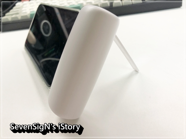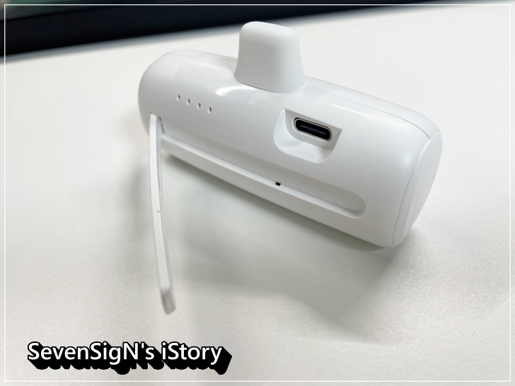 | 뒷쪽을 보면 충전 잔량과 함께 충전중일때는 충전 중임을 보여주는 LED 인디케이터가 있고, 그 옆에 USB-C 타입의 보조배터리 충전 단자가 있습니다. 그리고 그 아래의 가로바는 바로 거치대 기능을 하는 부분이죠.