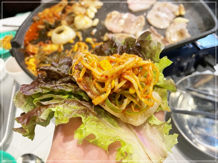고기올리고 콩나물 올리고 쌈장 얹어서 한입~