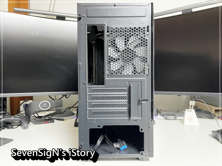 | 후면에는 기본적으로 LED팬이 하나 장착되어 있습니다. 그리고 미니타워 케이스 답게 PCI 슬롯은 4개가 준비되어 있구요. 그 아래로는 ATX 파워를 장착할 수 있는 공간이 보입니다.