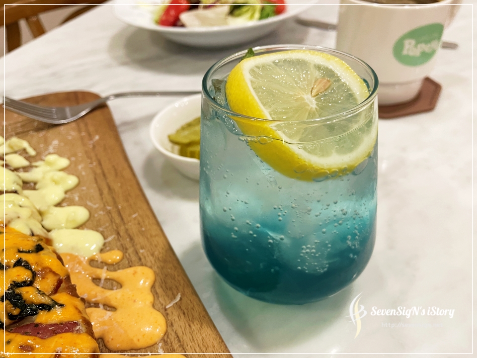 음료는 일단 시원한 청량감의 블루레몬 에이드부터 한잔 골랐습니다.