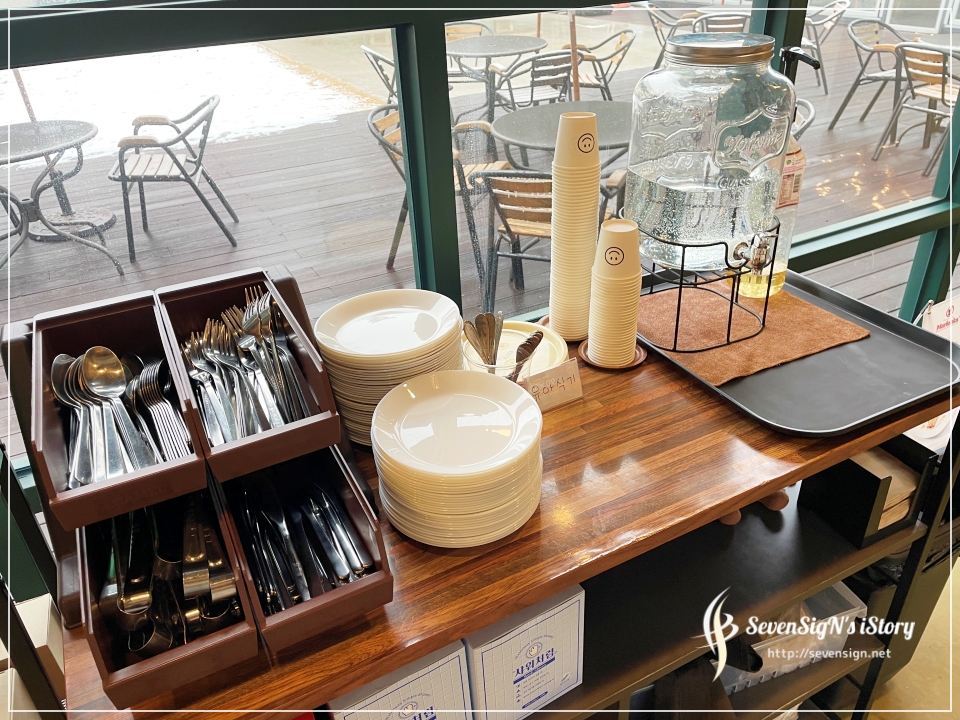 셀프바에서는 물과 접시, 수저, 나이프 등을 준비할 수 있습니다.