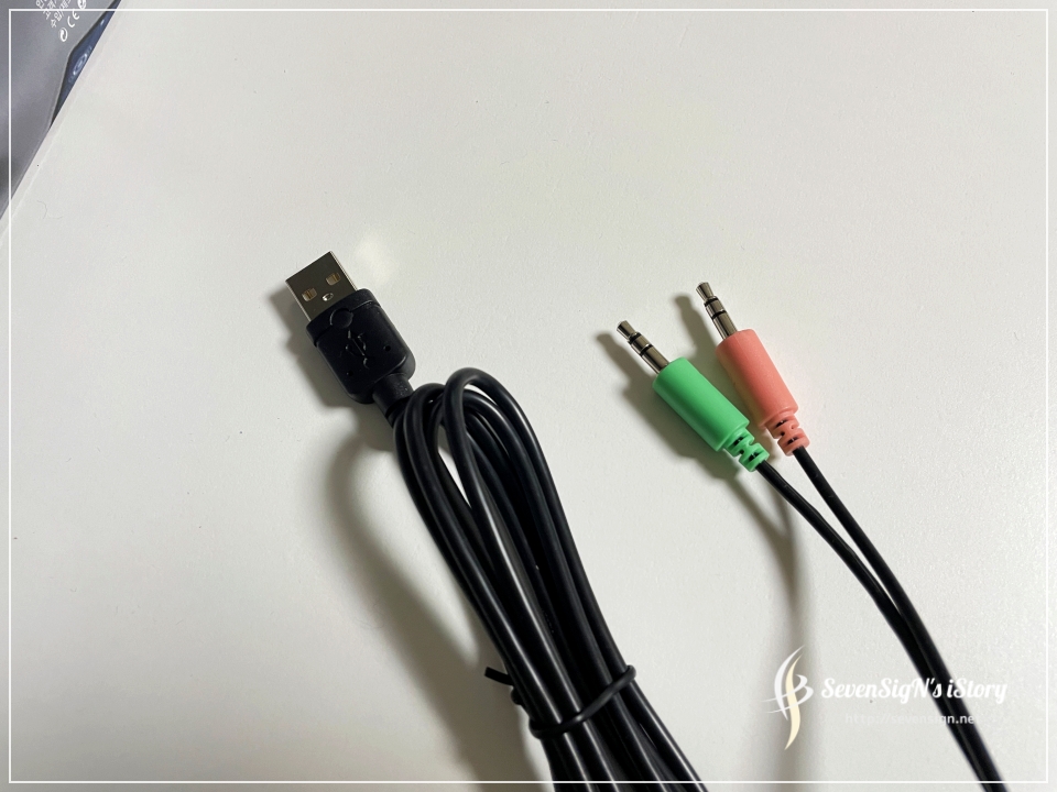 | 케이블은 전원 공급을 위한 USB케이블과 스피커와 마이크 케이블이 있습니다. 기본적으로 스피커/마이크 케이블을 컴퓨터 메인보드에 연결해 사용하고, 다른 기기는 블루투스와 연결하는 형태로 이용하면 될 것 같네요.