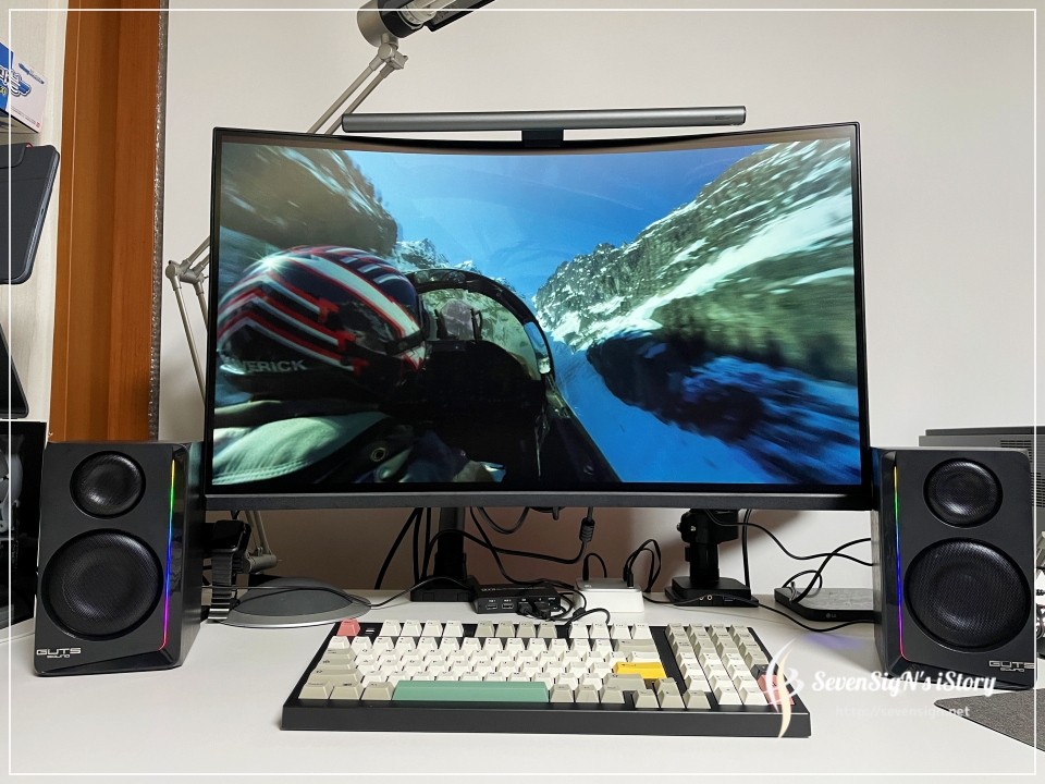 | 스피커를 설치하고 책상 올려보고 사진을 한장 찍어봤습니다. 데스크에서 좌우측 공간을 확보하거나, 좀더 공간감을 느끼고 싶다면 조금 더 거리를 벌려 두는 것도 괜찮을 것 같더라구요.