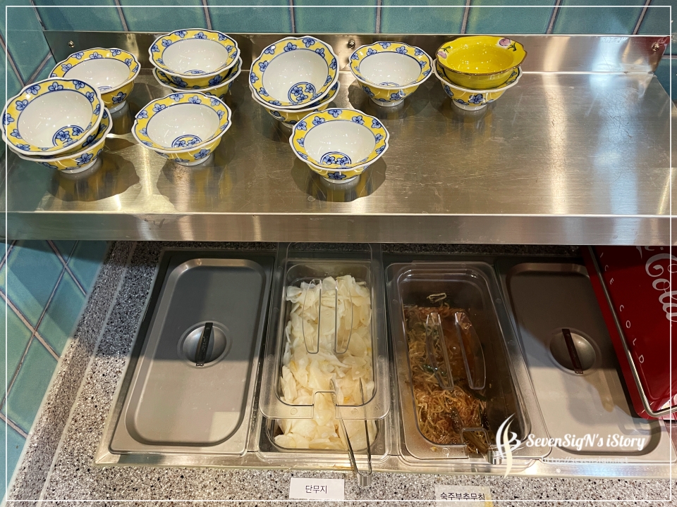 그리고 아까 위에서 얘기한 셀프바에서 단무지와 숙주나물볶음을 가져왔네요 ㅎ