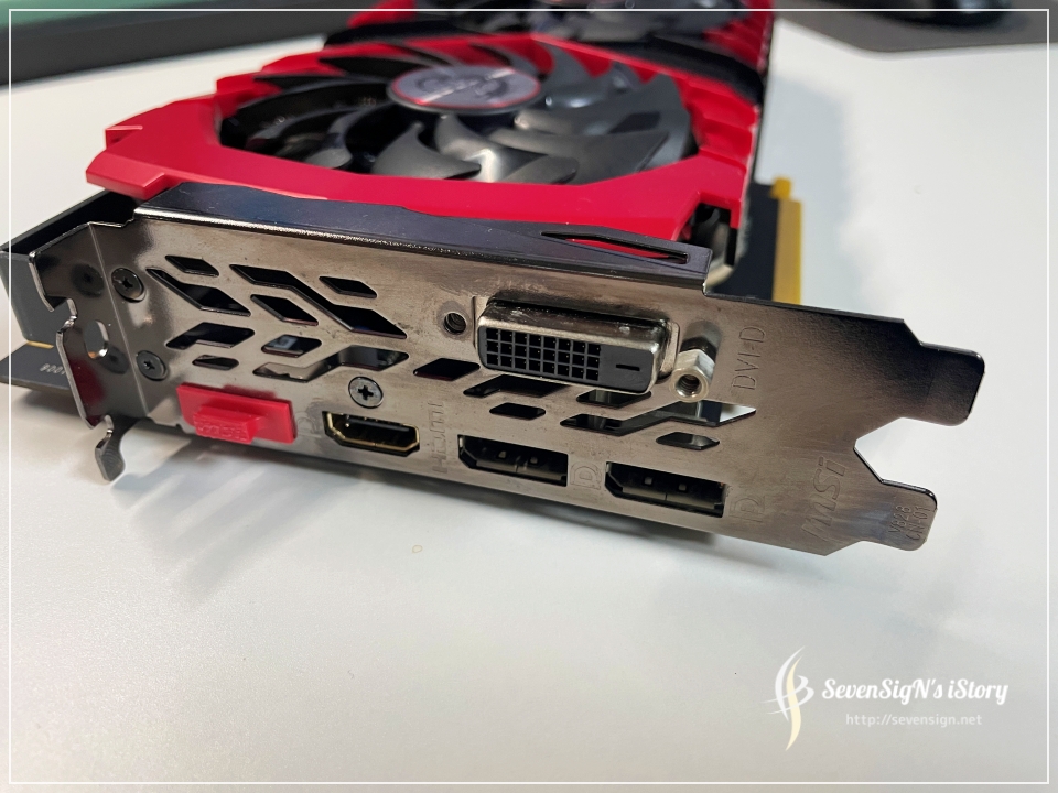 | 슬롯 부분도 큰 오염없이 비교적 깨끗한 편이었어요. 제가 닦는다고 닦았더니 오히려 더 번진 모습이네요 ㅋ 포트는 DP 3개, HDMI 1개, DVI 1개로 아주 여유롭습니다. 모니터 2개 이상 사용할일도 거의 없고 ㅋ