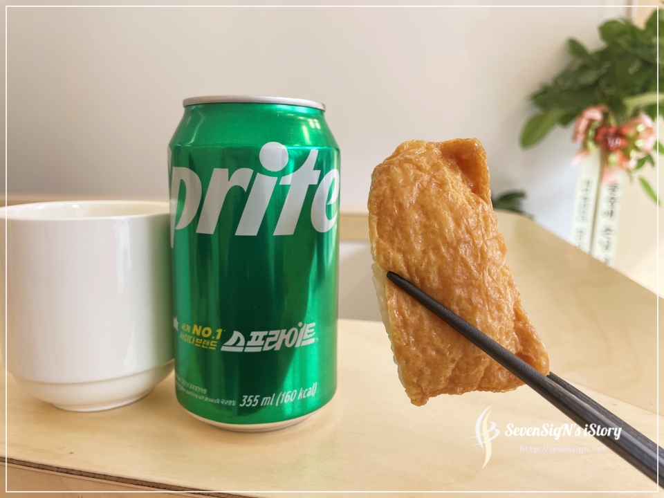 유부초밥 크기가 어느 정도냐면 스프라이트 캔 옆에 두어도 비길만한 정도죠 ㅋ