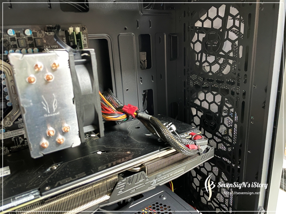 | 조립을 끝낸 모습입니다. 내부 공간이 넓기 때문에 특별히 조립하는데 어려움이 있진 않았습니다. 가로 길이 298mm의 3팬인 ASUS STRIX RX580 8G 그래픽카드도 여유롭게 장착된 것을 확인할 수 있습니다. 340mm 까지 장착이 가능하니 왠만한 그래픽카드는 장착이 가능한 확장성을 보여준다고 하겠습니다.