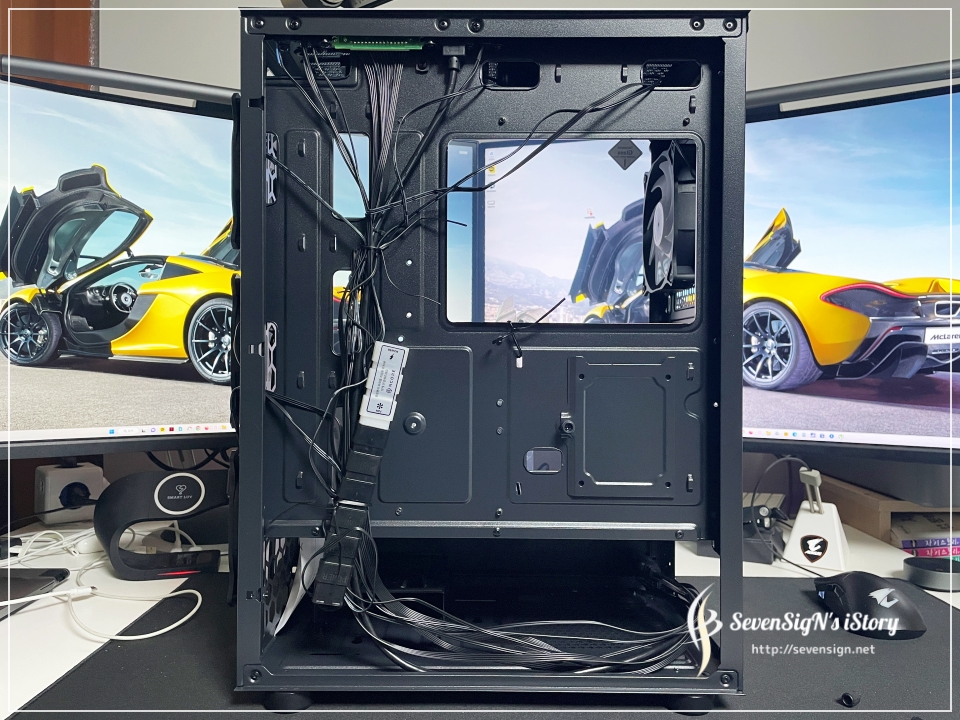 | 뒷면입니다. 선정리를 대충 해봤는데요, 공간이 빡빡하지 않아서 선정리도 크게 부담스럽지 않아서 좋더라구요. 선정리 고수분들은 더 깔끔하게 정리가 가능할거에요 ㅎ