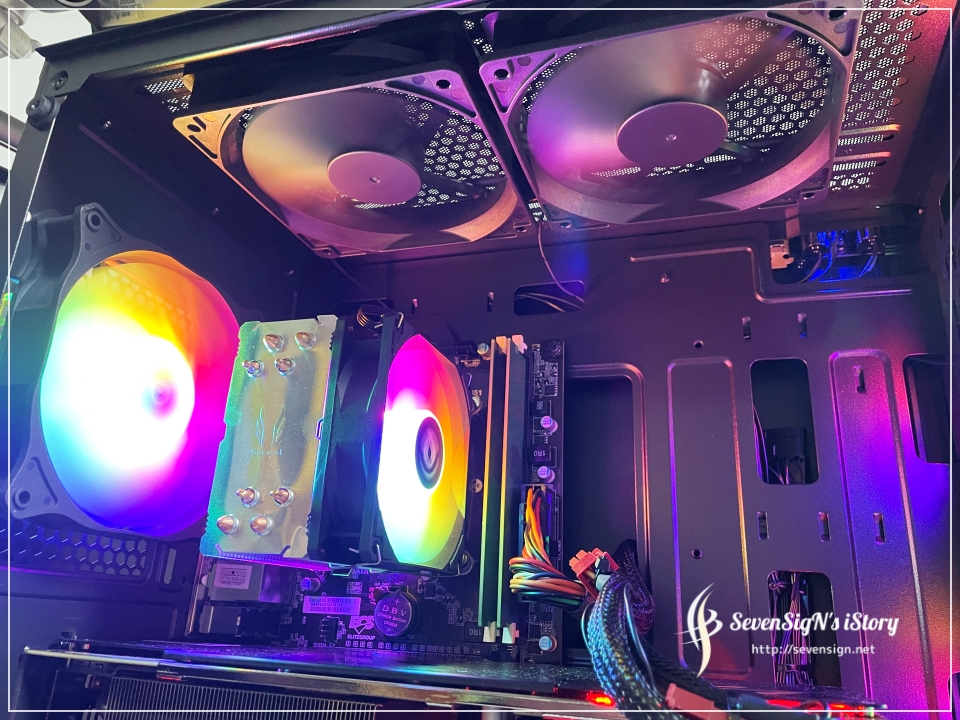 | 조립완료 후 전원을 켜본 모습입니다. 정상적으로 RGB가 켜지며 쿨링팬이 원할하게 돌아가네요.