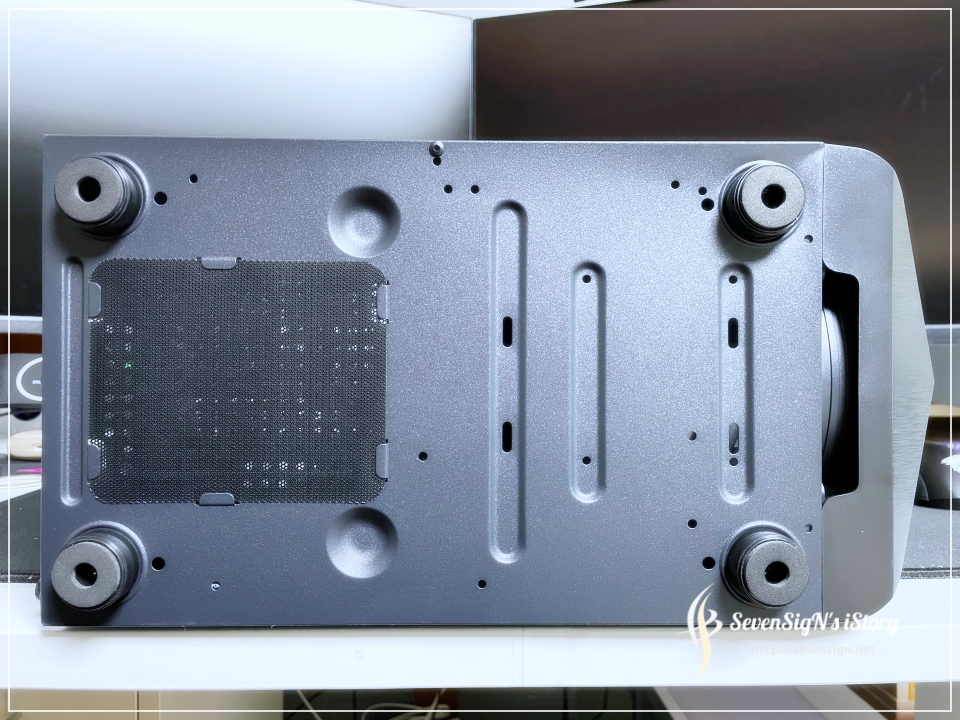 | 하단 부분입니다. 4개의 고무패드가 장착된 다리가 있고, 파워쪽에는 먼지필터가 있어서 먼지 유입을 줄여줍니다. 그리고 먼지필터 우측에는 바닥에 저장장치를 고정할 수 있는 나사구멍이 보이네요.