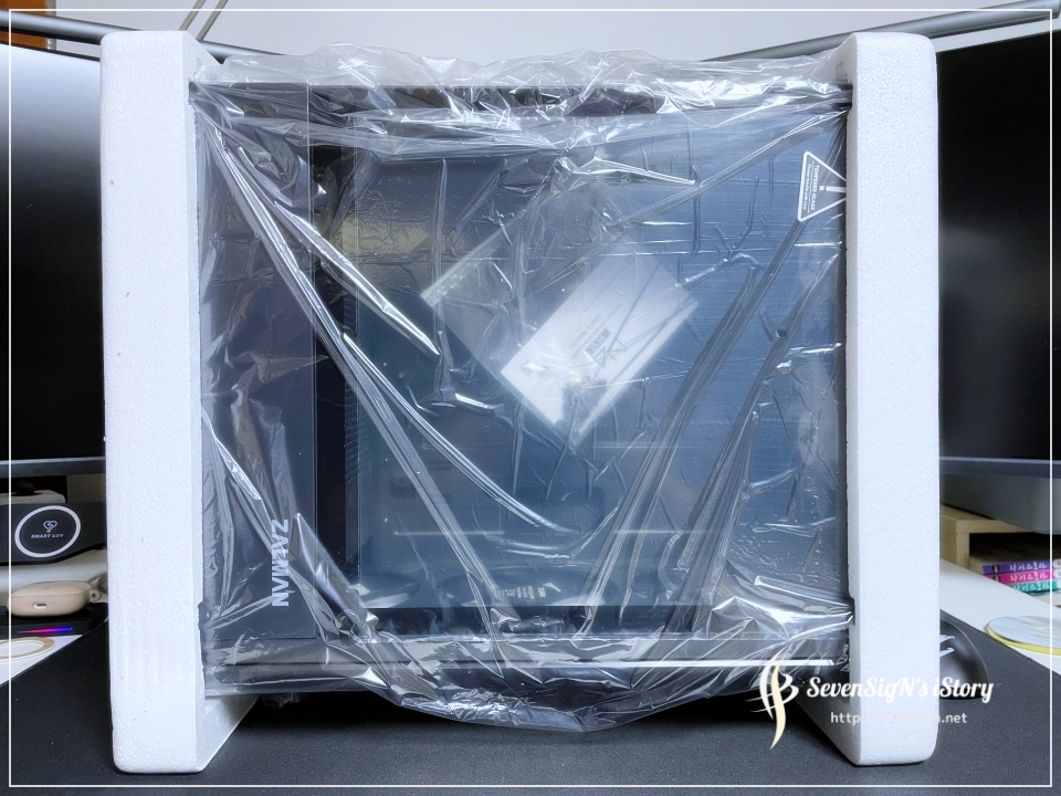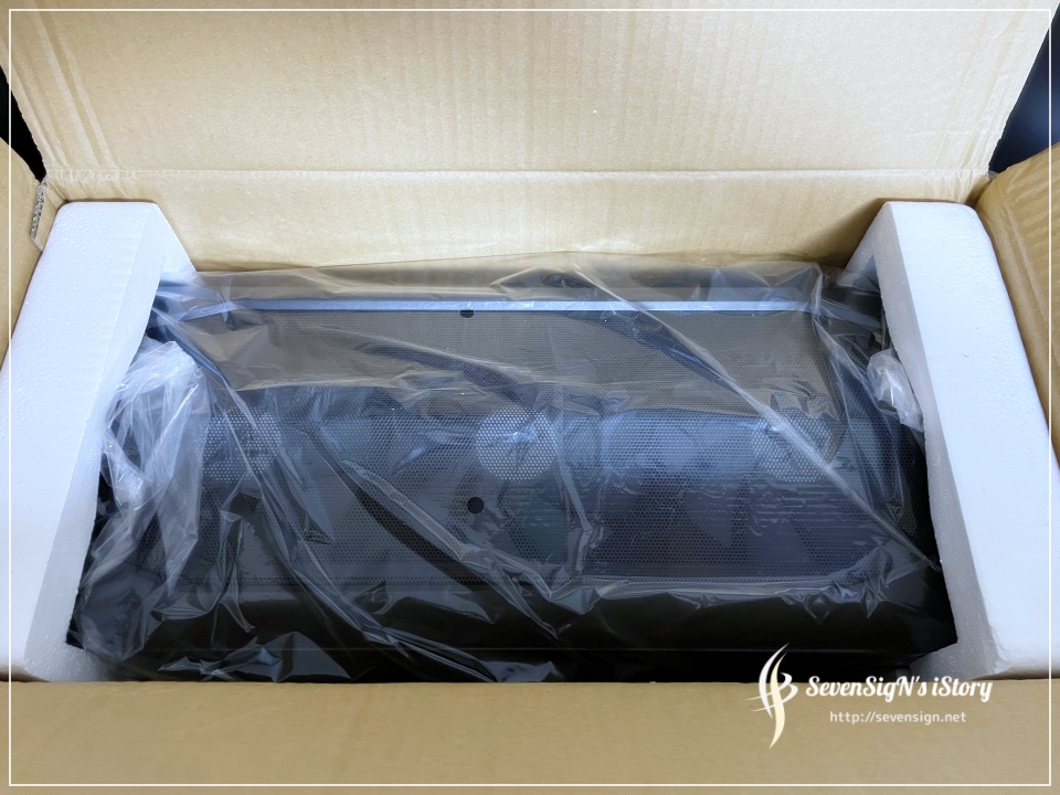 | 컴퓨터 케이스를 안정적으로 잡아주고 있는 스티로폼과 함께 안전하게 포장이 되어 있습니다. 그래도 혹시 모르니 개봉 후에는 항상 구석구석 잘 살펴서 이상한 부분은 없는지 체크해보는 것이 좋습니다.