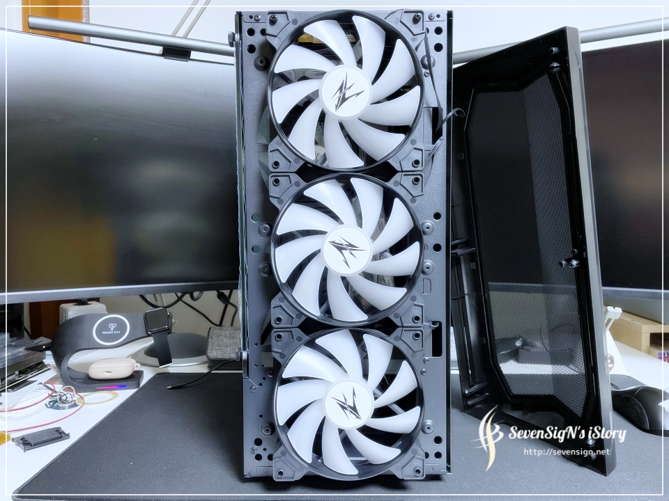 | 매쉬 디자인 그릴을 드러내봤습니다. 그릴은 아래쪽 홈을 잡아서 위로 잡아당기듯 분리해주면 되는데 어렵지 않게 분리할 수 있습니다. 140mm의 LED 팬 3개가 나란히 배치 되어 있네요. 풍부한 풍량을 흡수하며 내부 온도를 낮추는데 중요한 역할을 하는 부분이죠.