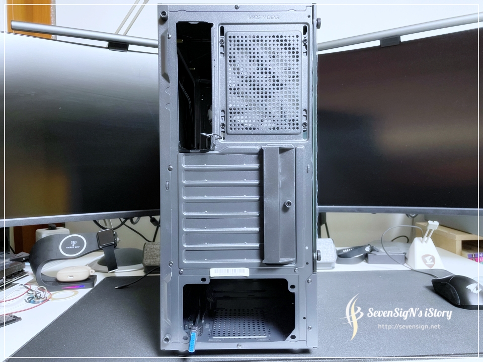| 뒷부분입니다. 7개의 PCI 슬롯이 있어서 확장성도 좋습니다. PCI 커버를 따로 두고 있어서 깔끔해 보이는 느낌도 전달해주네요.