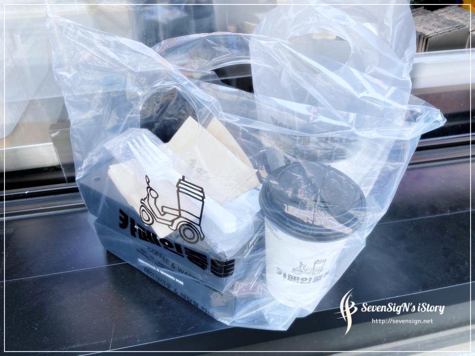 배달 오토바이 뒤에 테이크아웃 커피잔이 올려져 있는 특색있어 눈에 띄는 이미지와 카페인중독 간판이
