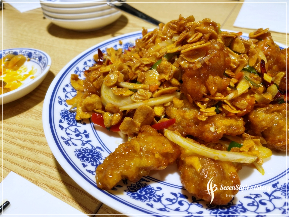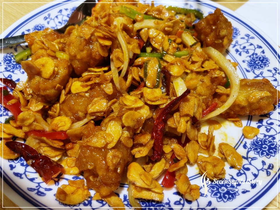 바삭하게 튀겨진 치킨이 마늘이랑 준화반점의 소스에 맛있게 볶아진 요리라