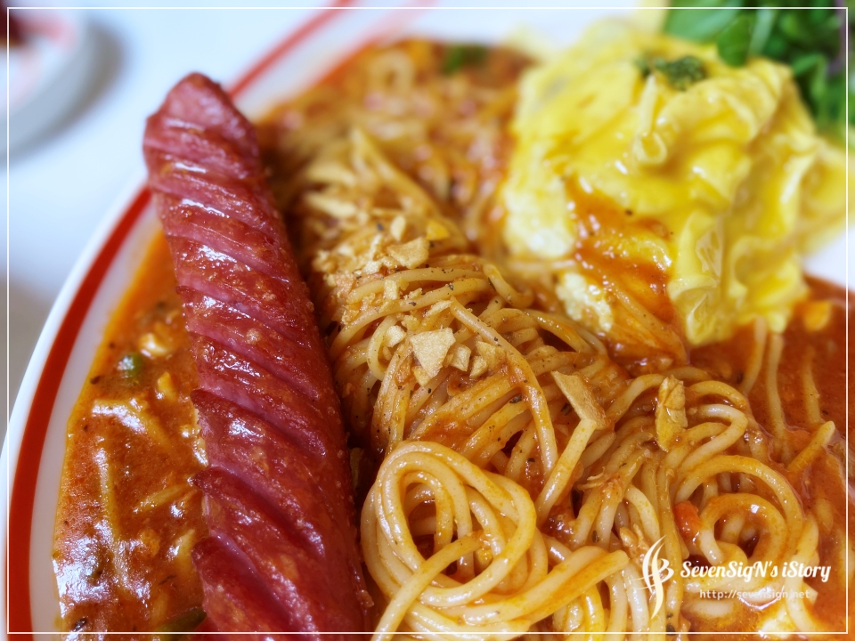 미트 파스타 오므라이스의 소세지는 토핑으로 추가한거에요.