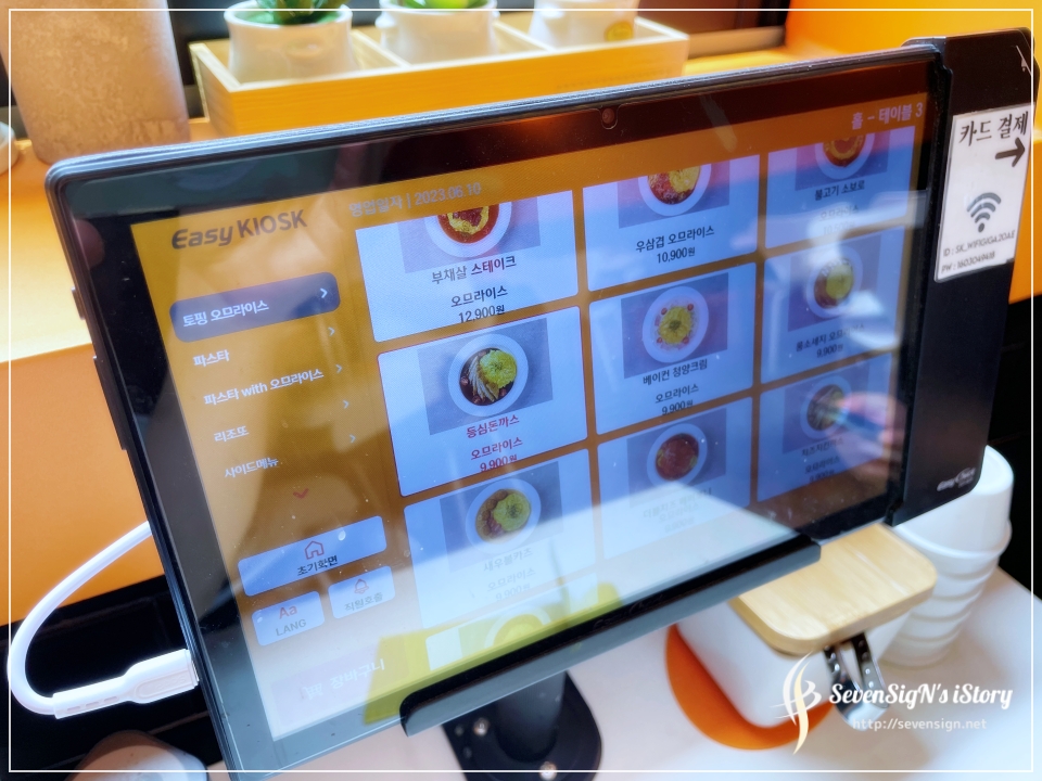 오므파탈에는 테이블마다 이렇게 터치디스플레이가 설치되어 있어서 이걸로 주문을 하면 됩니다.