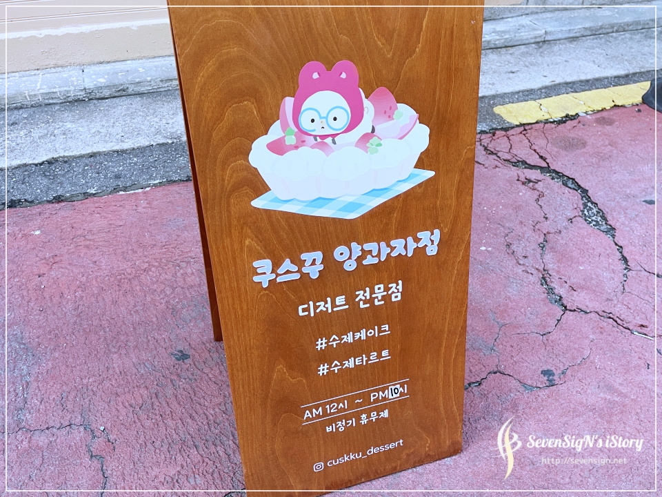 귀여운 캐릭터의 매장 앞 간판에는 쿠스꾸앙과자점 영업시간이 안내되어 있으니 한번 확인을 하고요~