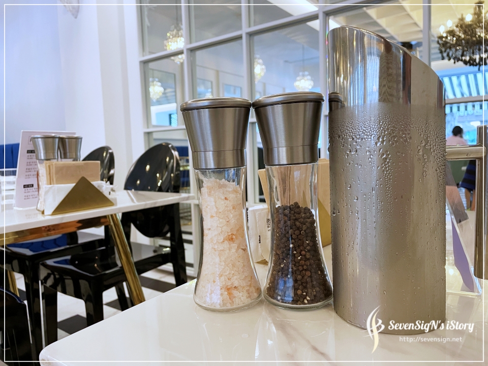 테이블에는 통후추와 소금이 놓여져 있고, 오른쪽에 보이는 건