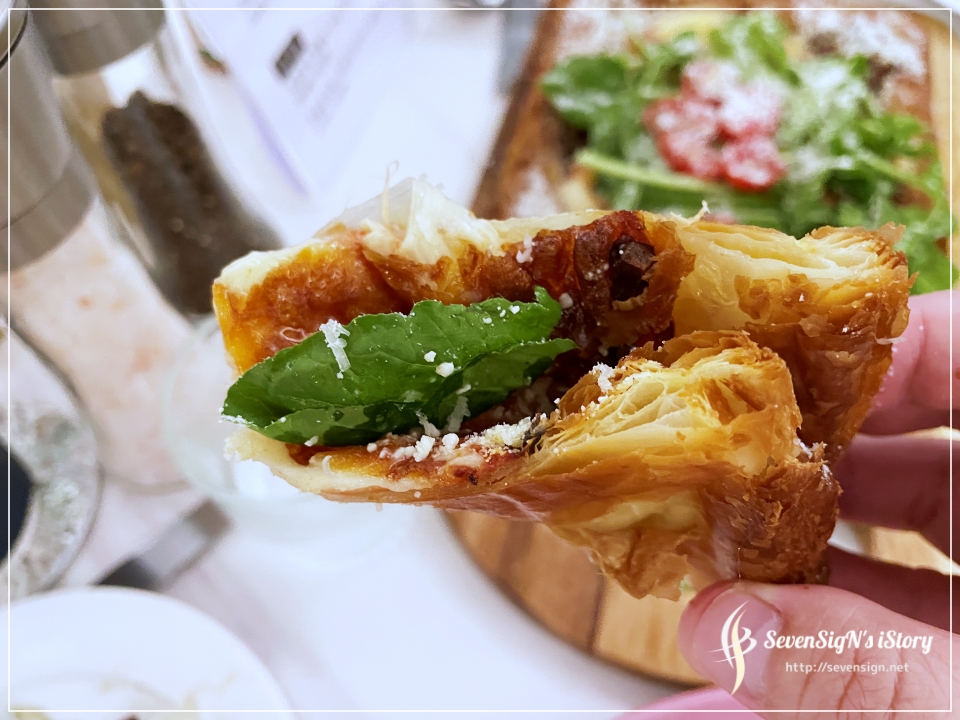 사각피자인데요, 일반도우가 아니라 페스츄리 빵으로 된 도우라