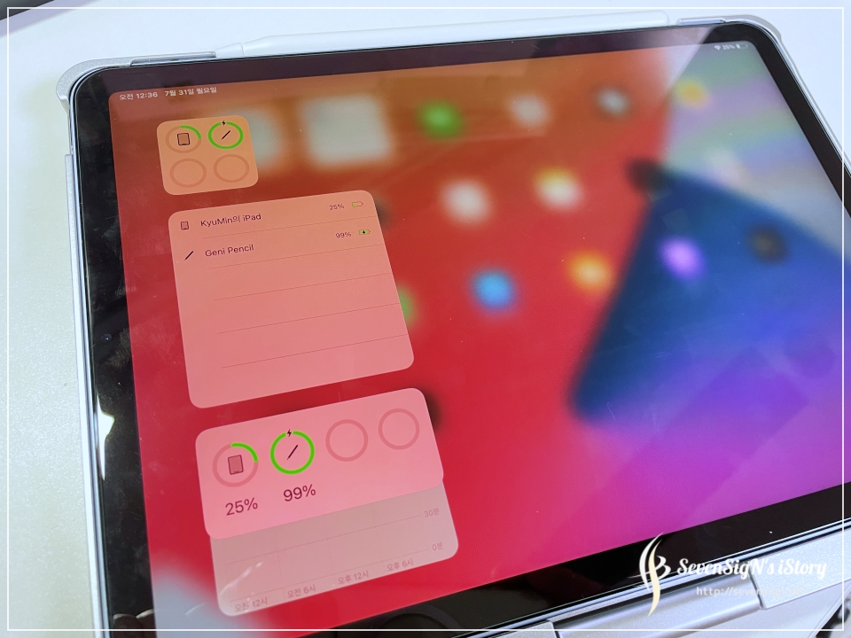 | 아래 사진에서 잘 안보이는데 ㅋ 윗쪽에 지니펜슬을 애플펜슬과 마찬가지로 착~하고 부착해둔건데요, 확인해보면 이렇게 무선으로 충전도 되고 있는 것을 확인할 수 있습니다.