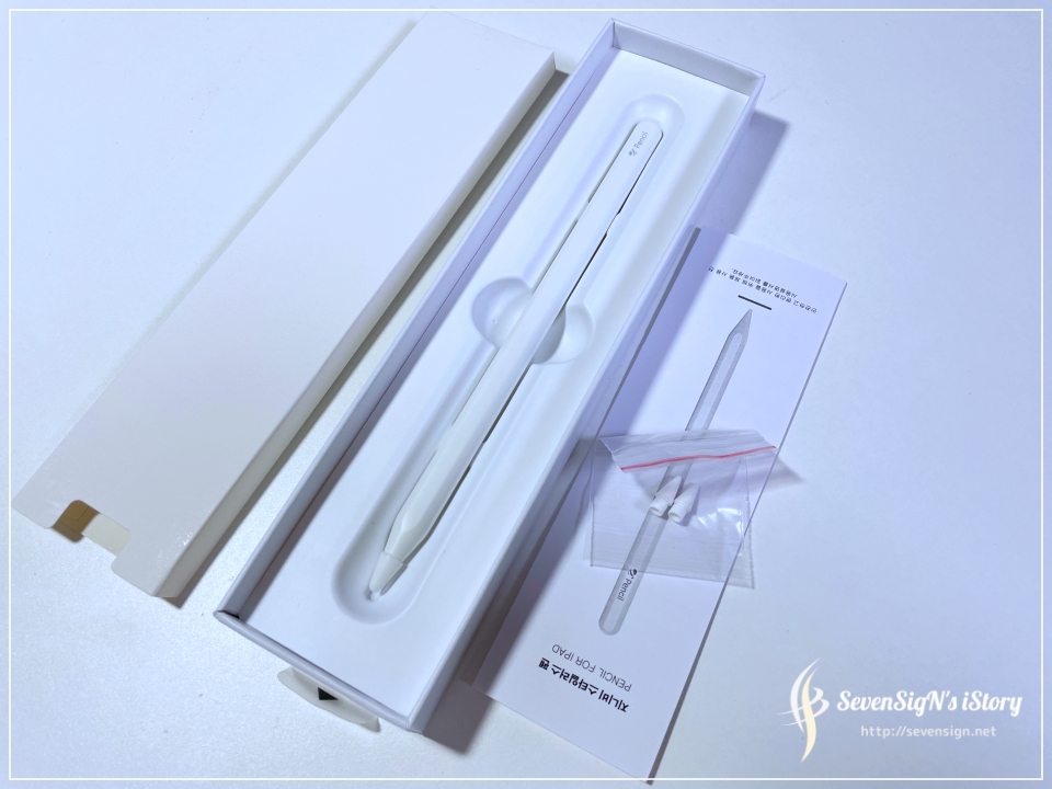 | 부속품이 들어있는 내부 상자를 드러내면 애플펜슬.. 아니 지니펜슬이 있는 것을 확인할 수 있습니다. 사용설명서와 함께 펜촉도 2개 추가로 포함되어 있더라구요.