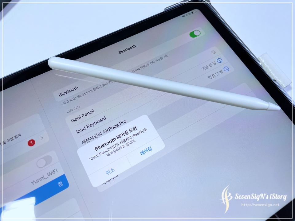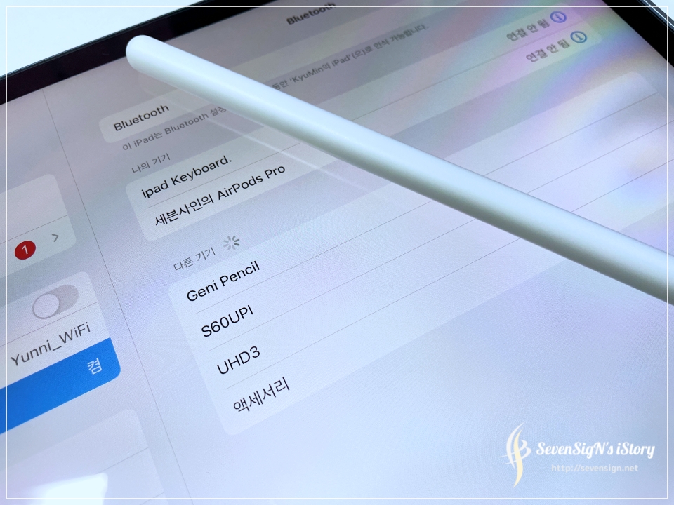 | 지니펜슬도 따로 조작하지 않아도 아이패드의 블루투스 메뉴에 가면 Geni Pencil로 인식을 합니다. 터치해주면 바로 연결되어서 사용할 수 있죠. 소위 1세대 짭플펜슬로 불리는 것들과 달리 사용성 측면에서 애플펜슬과 다른점이 거의 없거든요.