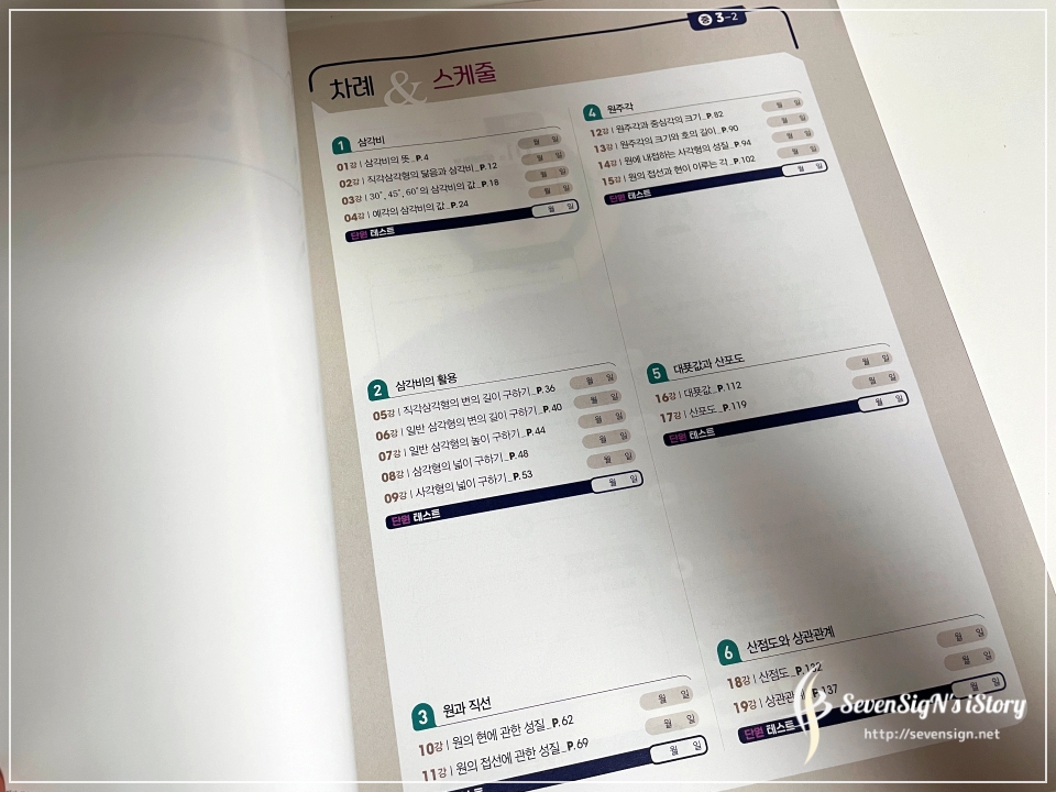 삼각비, 삼각비의 활용, 원과 직선, 원주각, 대푯값과 산포도, 산점도와 상관관계에