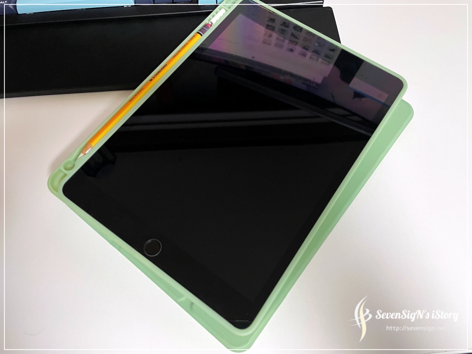 | 강화유리도 부착하고 케이스에 장착한 모습입니다. 아이패드 8세대는 애플펜슬 1세대를 지원하거든요. 그래서 다행히 아이패드 프로 9.7에 사용하던 펜슬을 그대로 사용할 수 있게 되었죠.