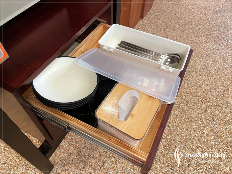 테이블 옆쪽 아래서랍에 앞접시, 티슈, 수저 등등이 있어요