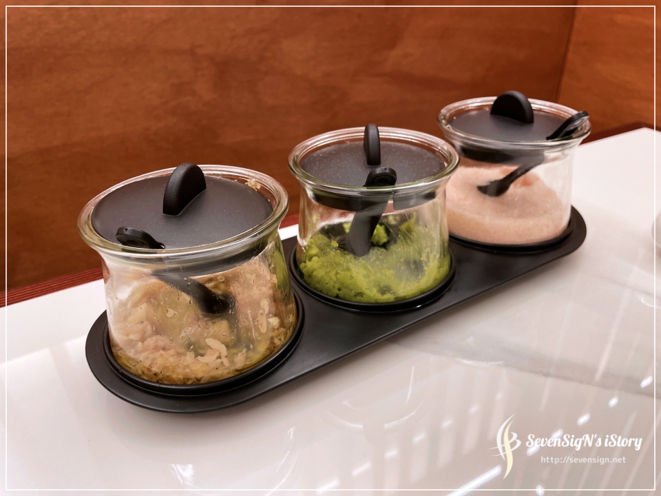핑크소금과 고추냉이는 소고기에 좋고, 새우젓은 잘 아시듯 돼지고기에 잘 어울리죠 ㅋ