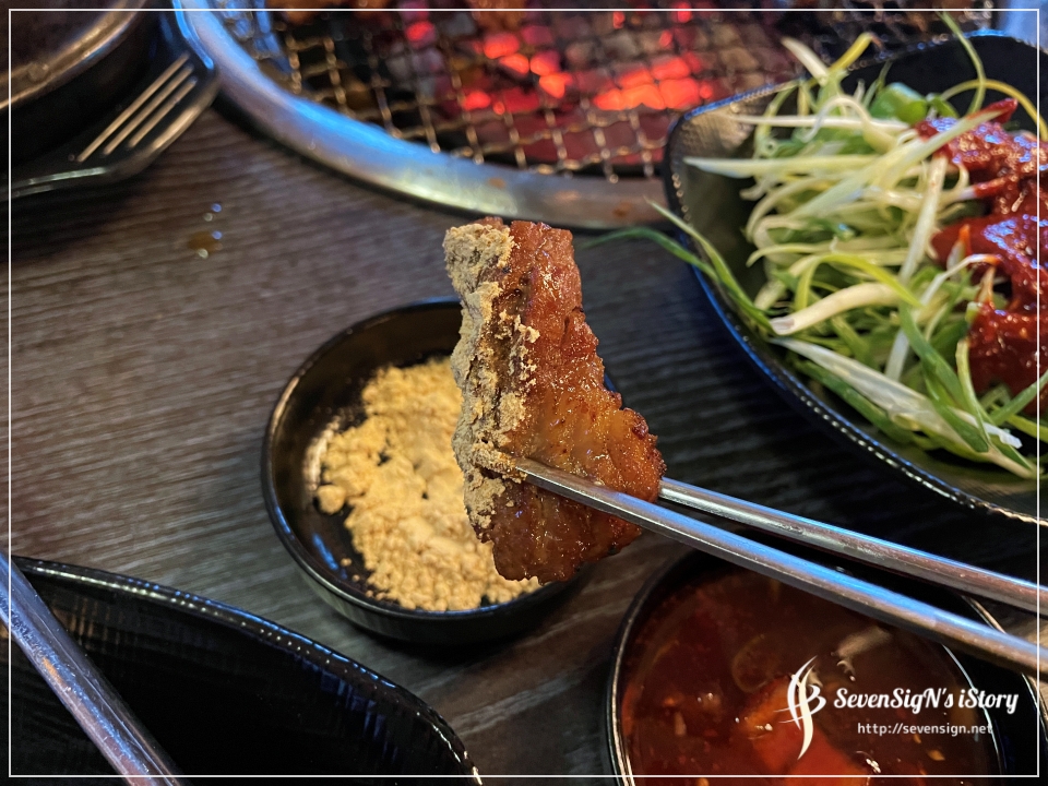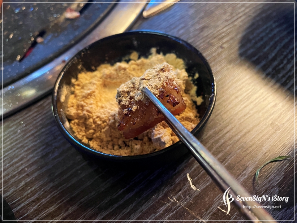 삼겹살, 그리고 특히 돼지껍데기는 콩가루에 찍어먹어야 제맛인...