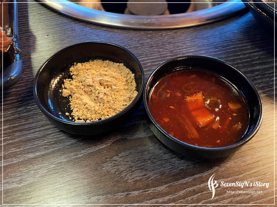 고기는 양념소스와 콩가루에 찍어먹어도 되고