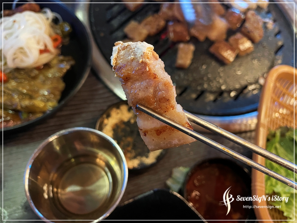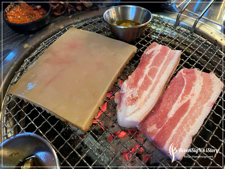 돼지갈비 맛에 취한 상태에서 삼겹살과 돼지껍데기도 올려주었네요.