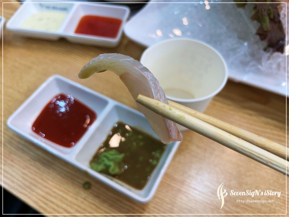 회 한점 집어서 고추냉이 간장에도 찍어먹어보고, 초장에도 찍어먹어보면서