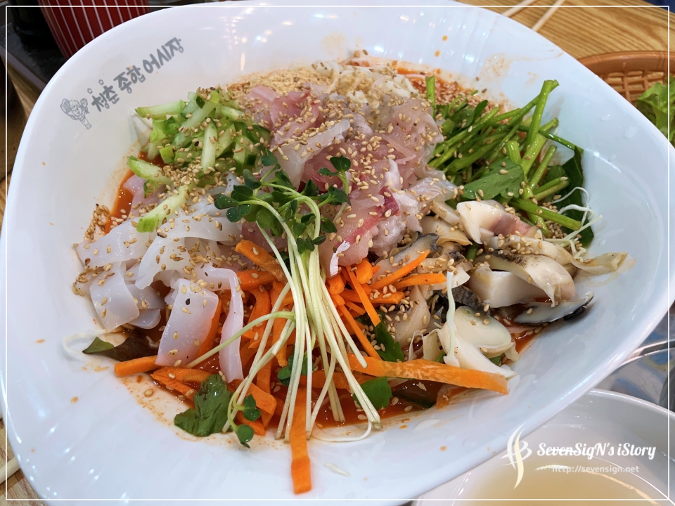 싱싱한 횟감하며, 야채와 해물이 아주 푸짐하게 담겨져있고