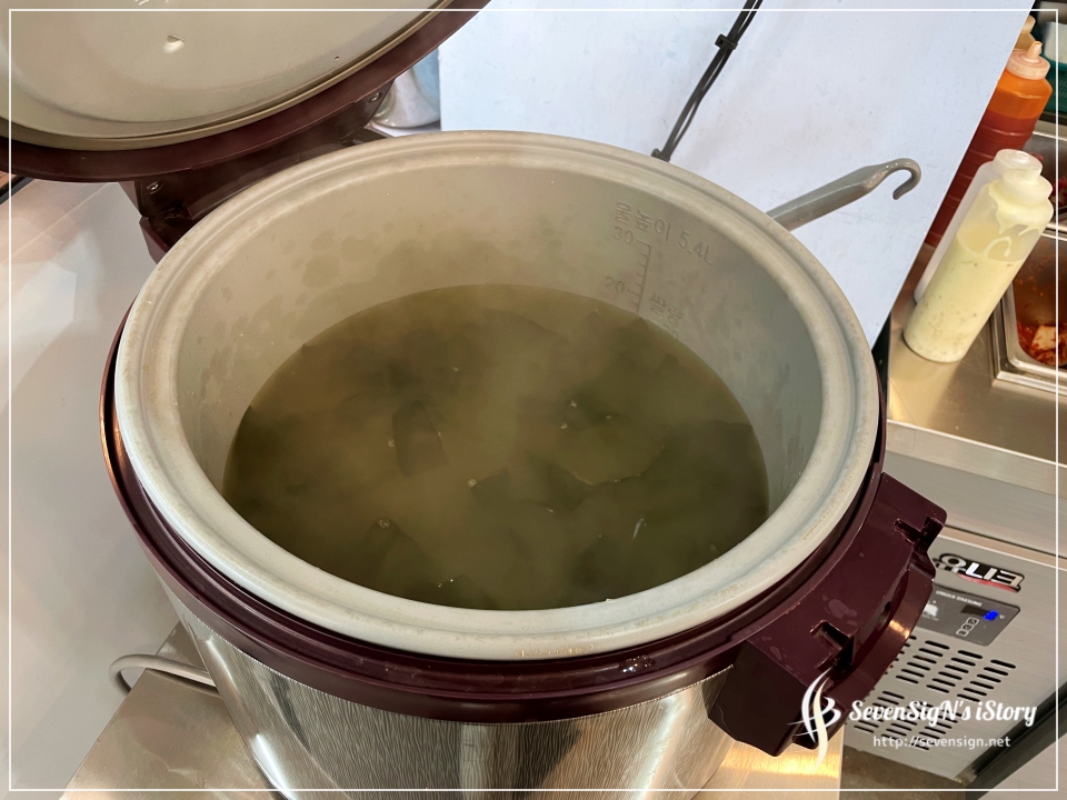 셀프바 한쪽에는 미역국이 한가득 끓여진 밥통이 있는데요,