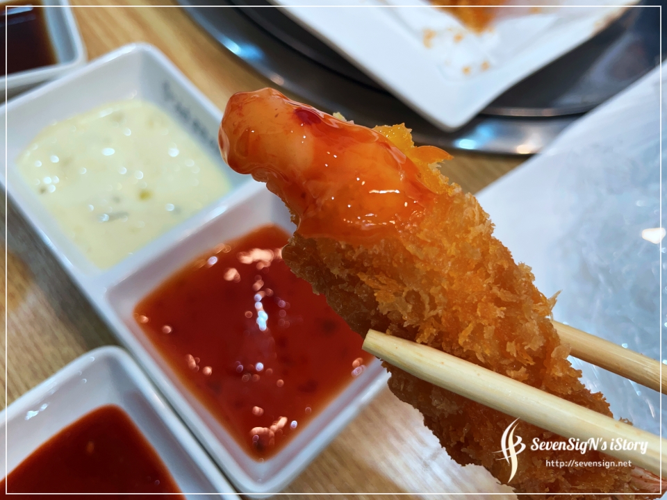 일단 겉보기부터 합격인데 진짜 왕새우를 바로 튀겨낸건데 겉은 아주 바삭하구요,