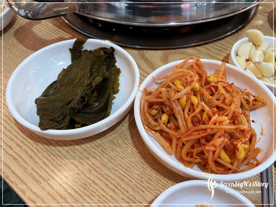 파절이무침과 콩나물, 김치도 맛이 좋은데, 콩나물 김치는 같이 구워먹으면 좋을 것 같았습니다.