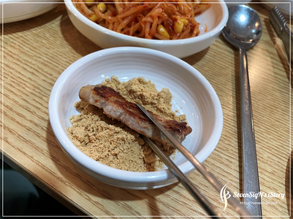 첨엔 그냥 고기만 한번 먹고 콩가루에 찍어서 맛을 봤는데요,