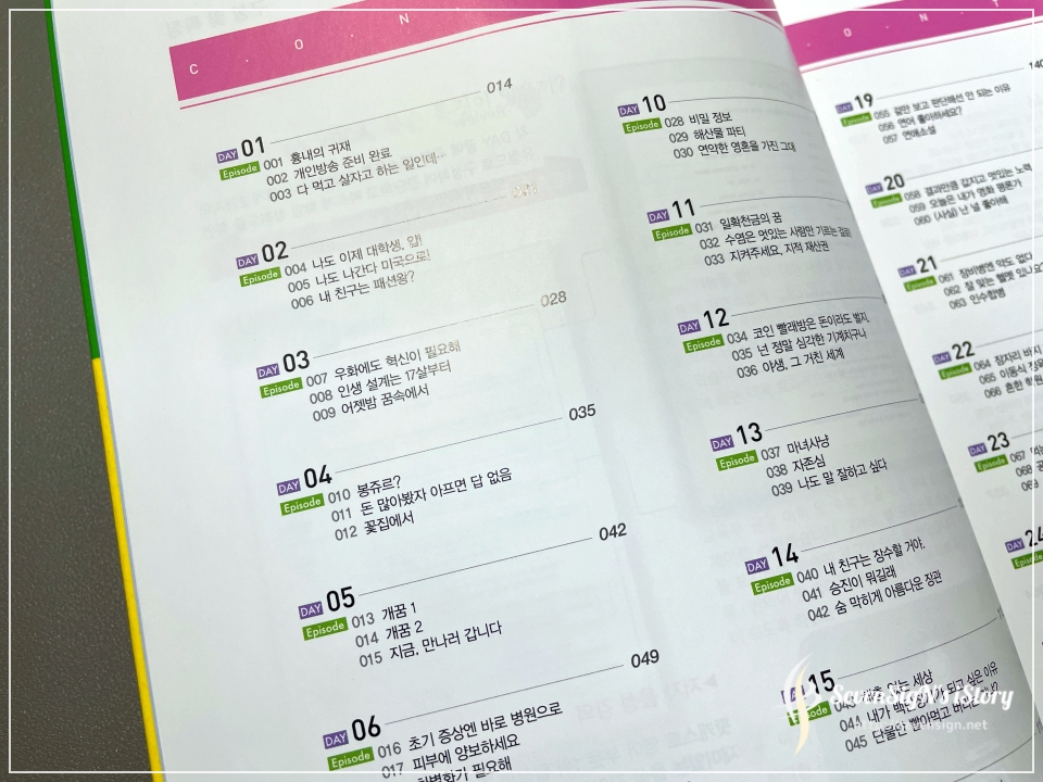 하루치 학습 내용은 짧은 대화식 에피소드와 함께 에피소드를 구성하고 있는